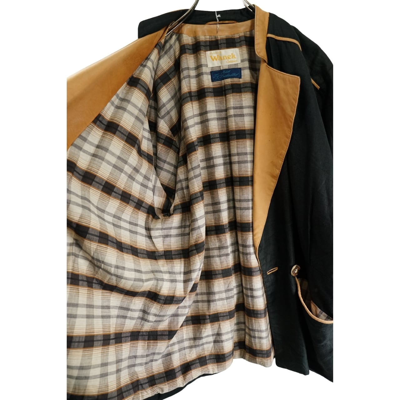 襟・ポケット口・袖口にレザーを効かせたコントラストのあるデザインと、チェック柄の裏地がクラシカルな雰囲気を引き立てます。