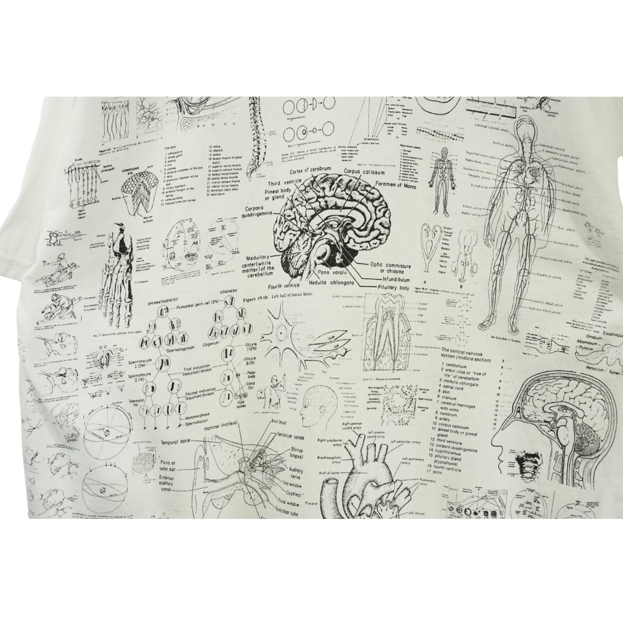フロント・バックともに人体図や脳、細胞図解などの科学モチーフがびっしりとプリントされた、まさに“BLINDED BY SCIENCE”な一枚。