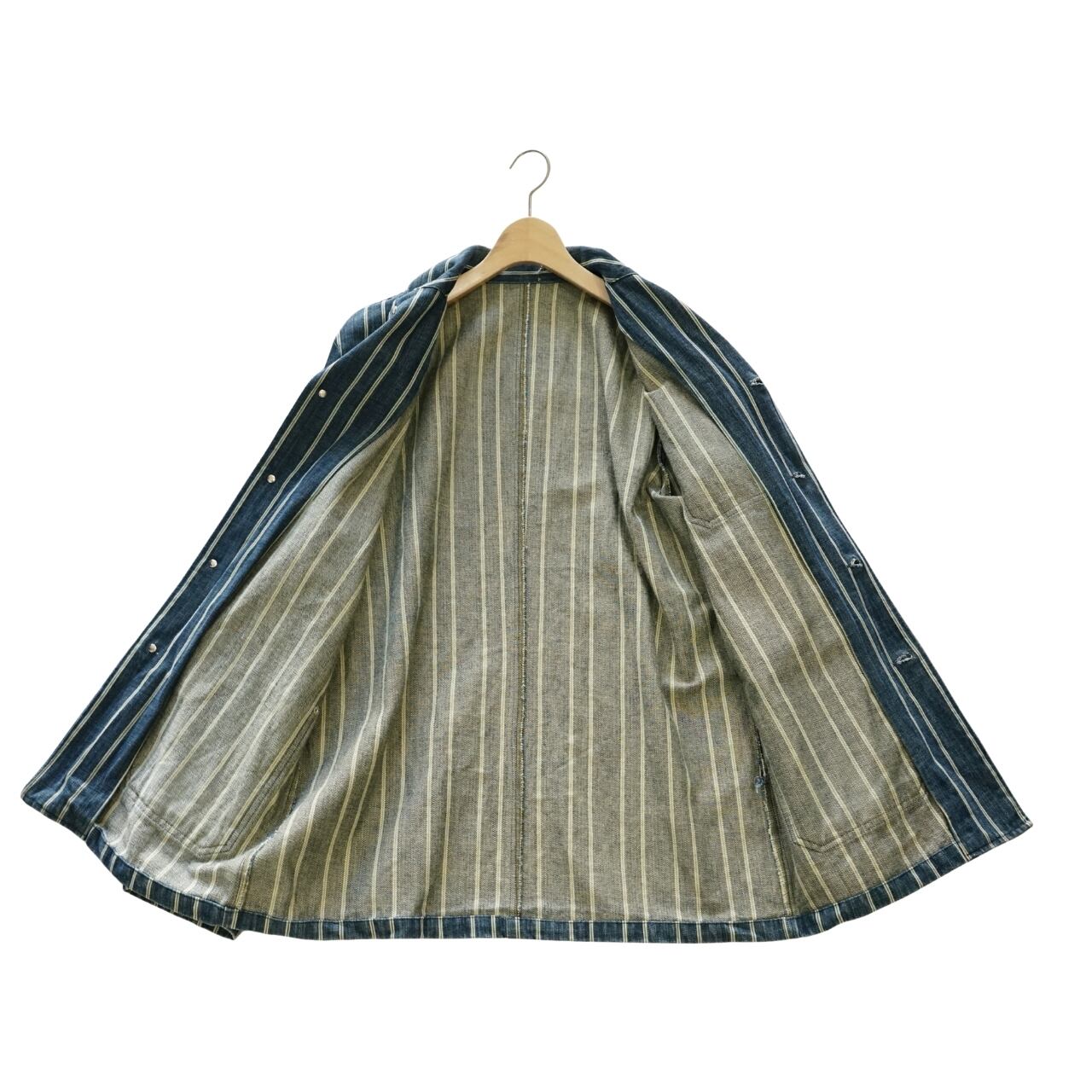 インディゴ調の生地に生成りのストライプが映えるデニムジャケットです。