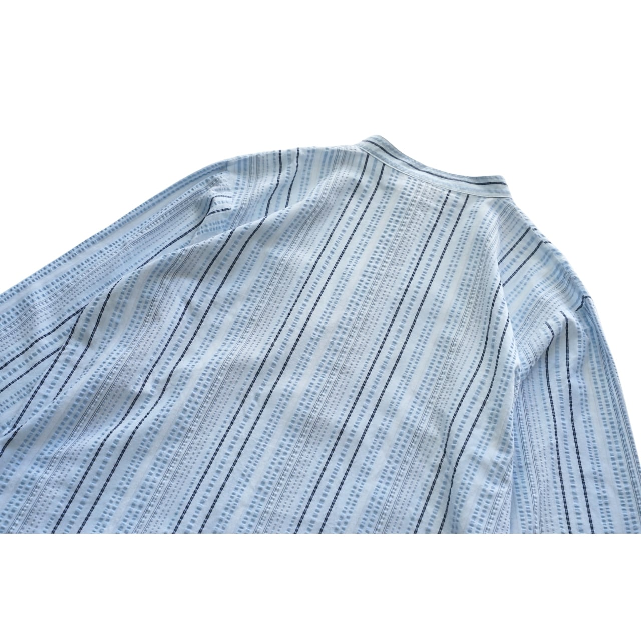 バンドカラーに胸ポケットを備え、ストライプ織りの生地が軽やかな印象です。