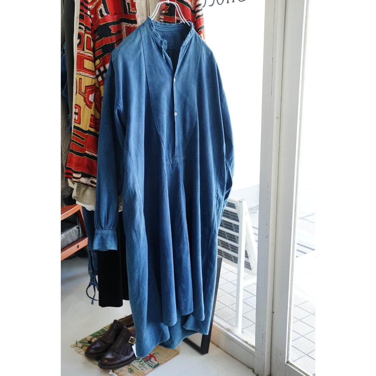 アンティーク グランパシャツ 藍染め ガラスボタン ロング丈 プルオーバーシャツ(1900〜20’s頃)|NA392