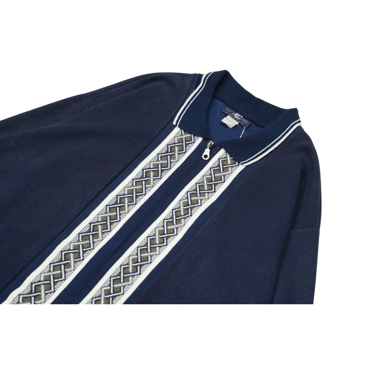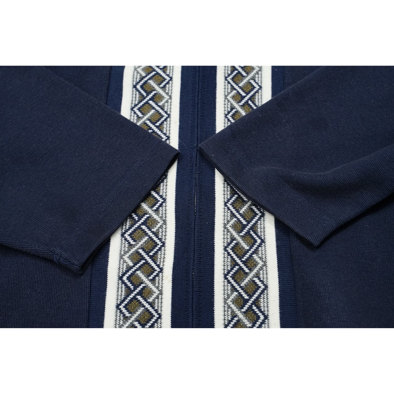ネイビーカラーをベースに、フロントの編み柄ラインが印象的な一着。