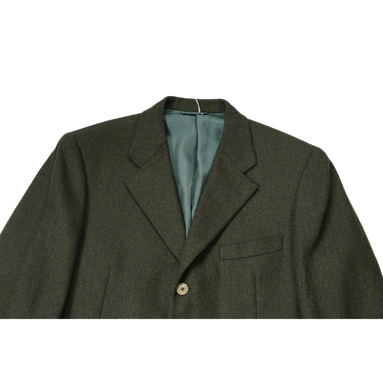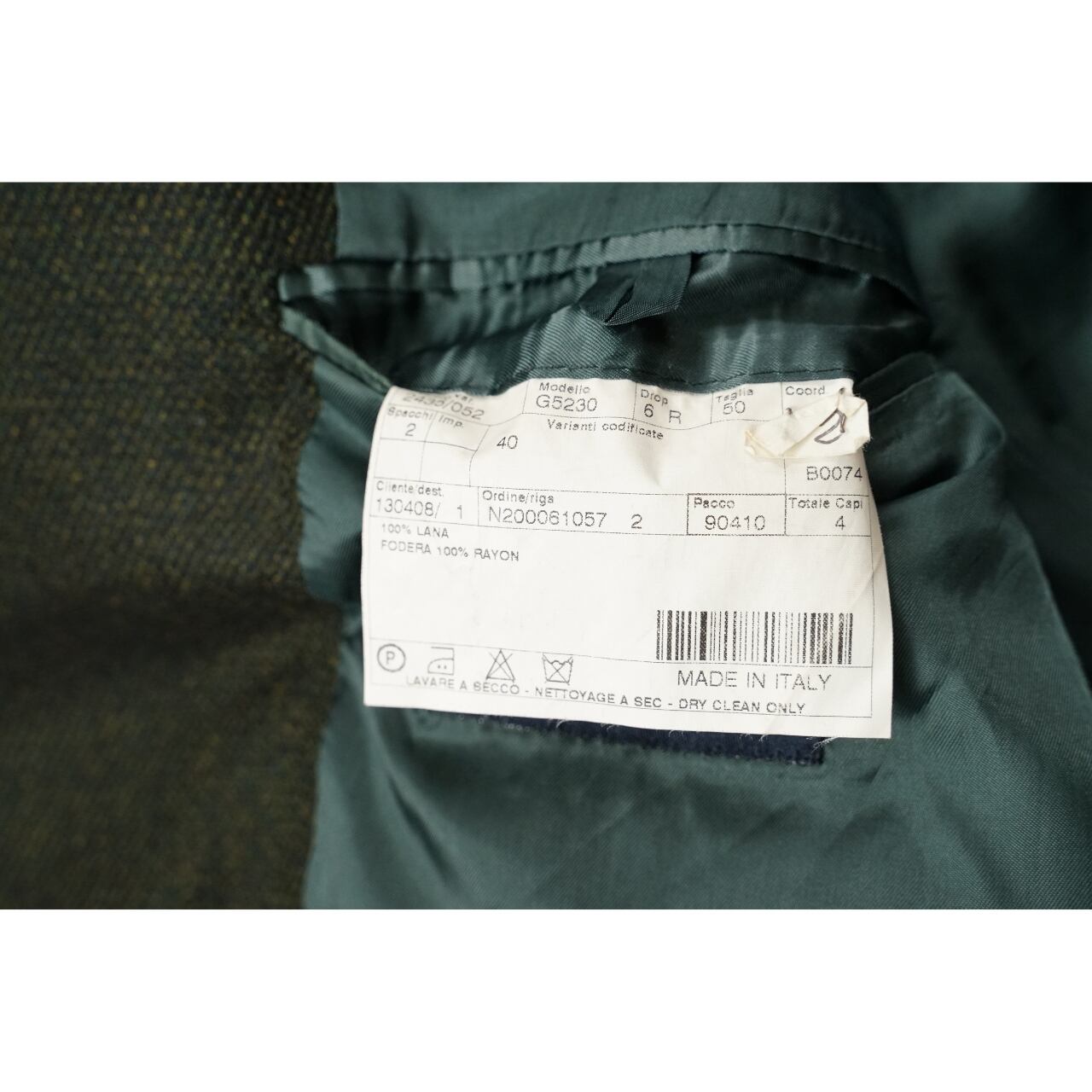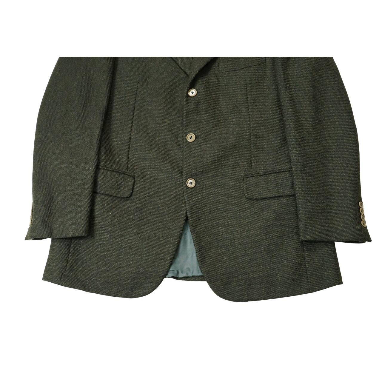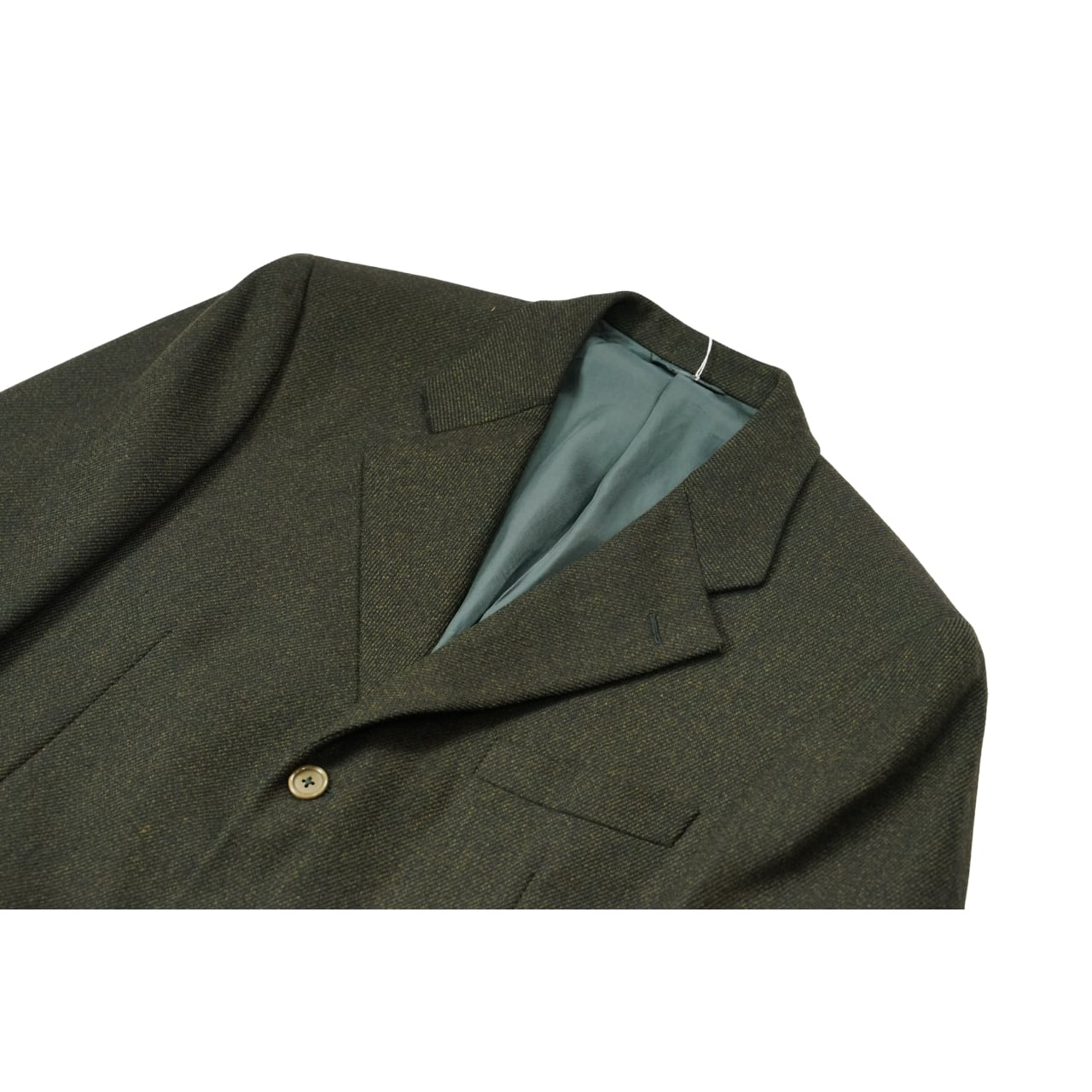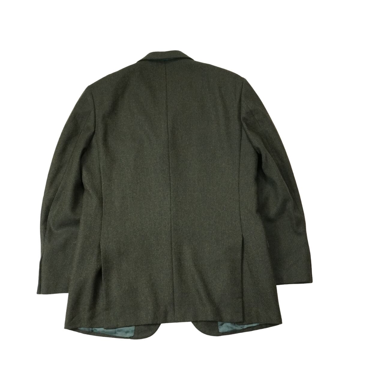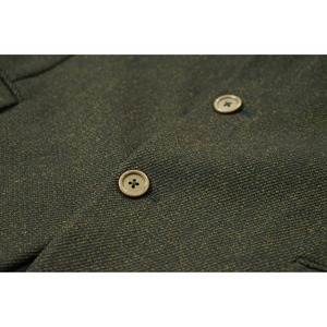 ウール100%の生地を使用し、落ち着いたオリーブ系カラーが特徴。