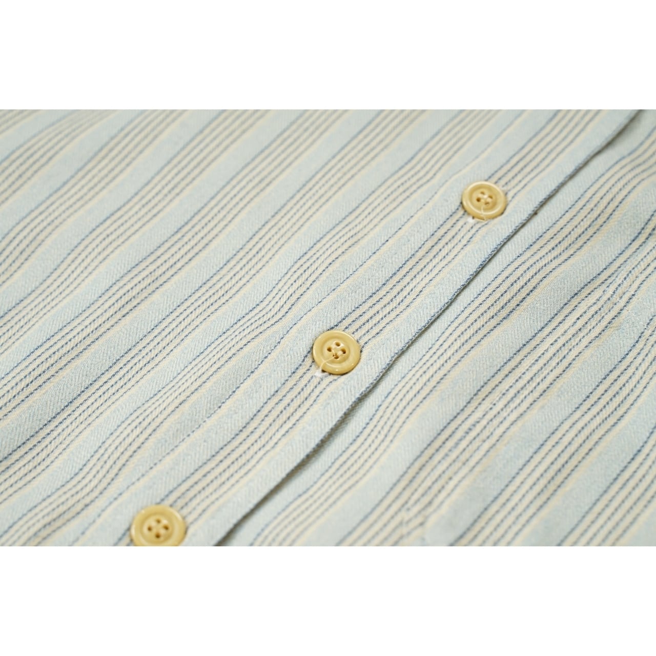淡いブルーをベースに、生成りとネイビーの細かなストライプ柄。
