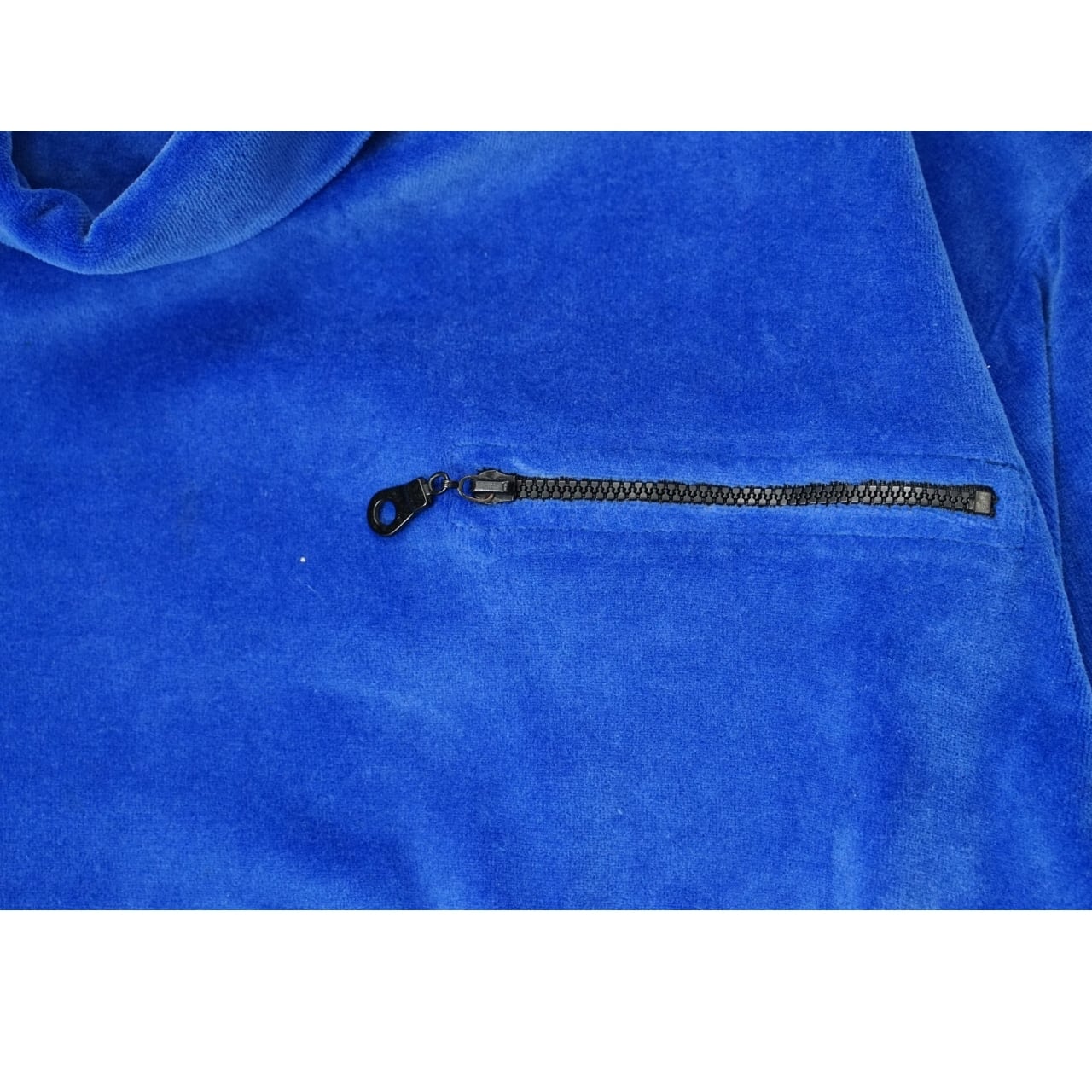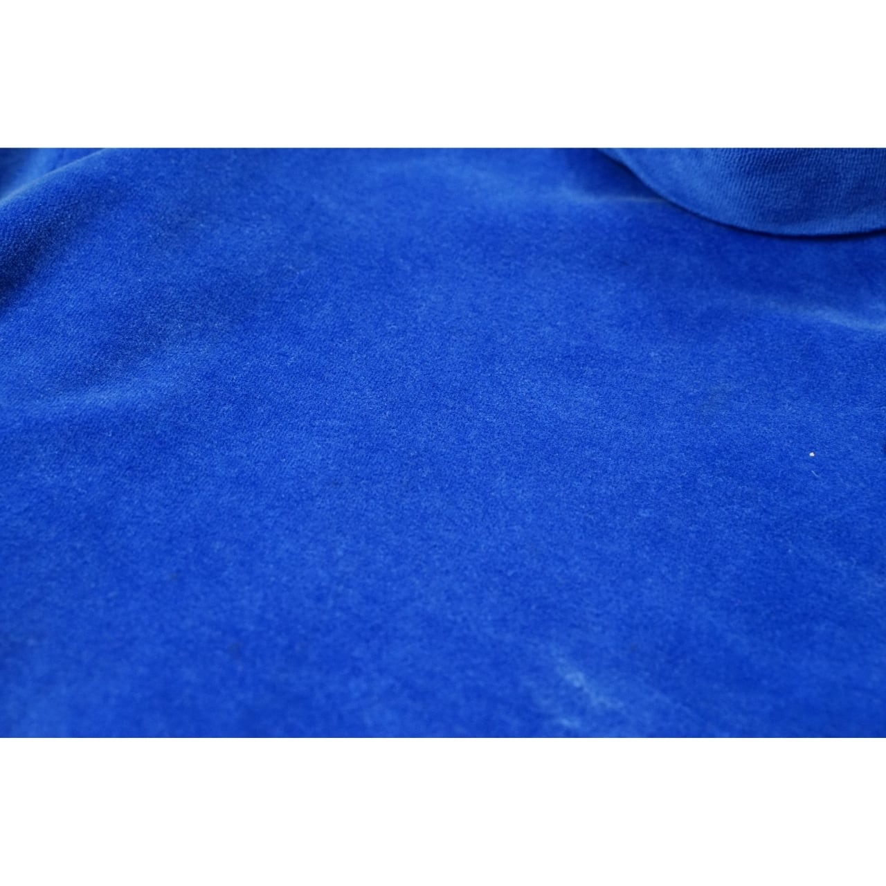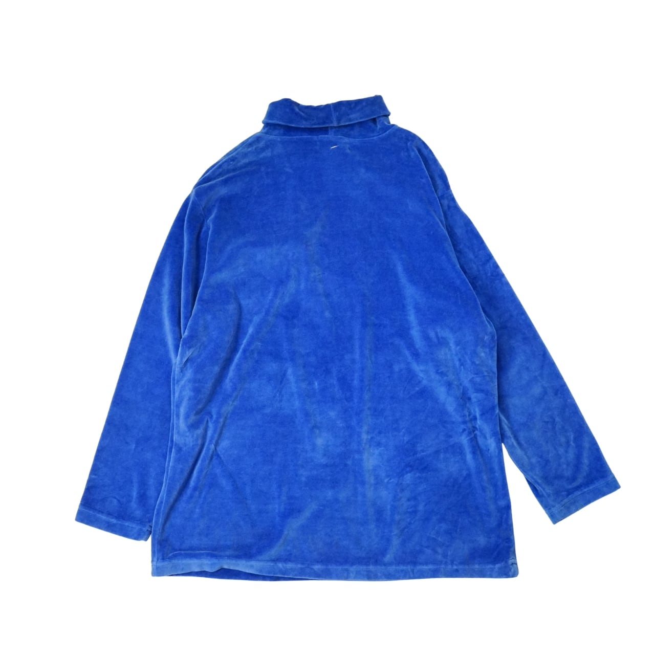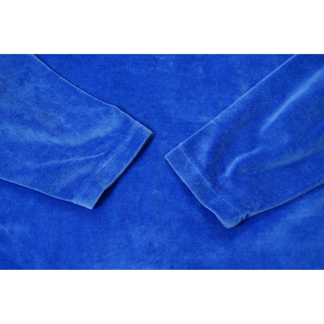発色の良いブルーカラーと、滑らかなベロア素材が印象的な一着。