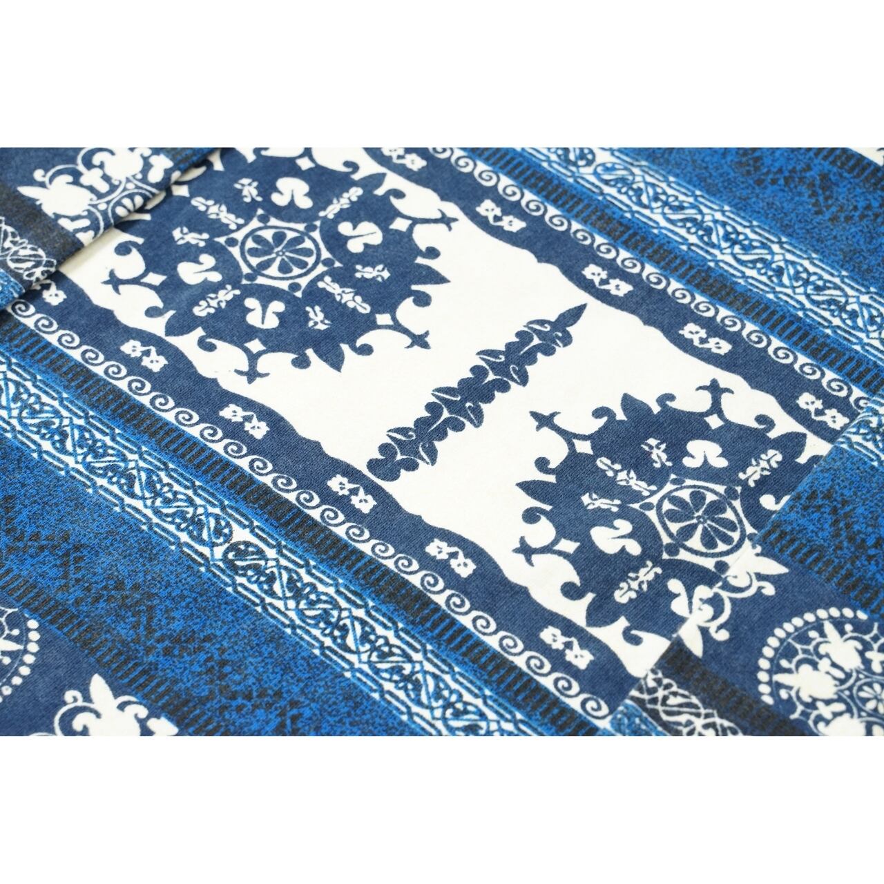 ブルーを基調にしたオリエンタル調のボーダー×モチーフ柄が全面に配され、1枚でしっかりと存在感のあるデザイン。