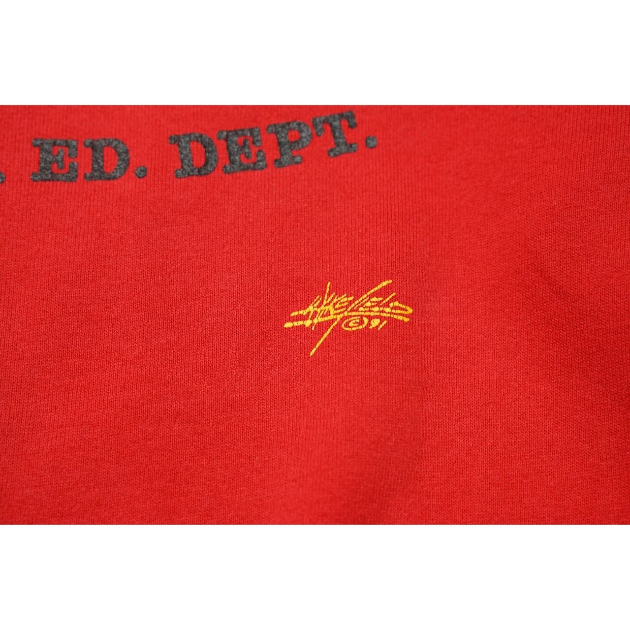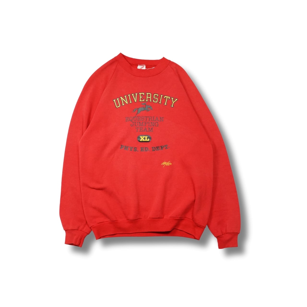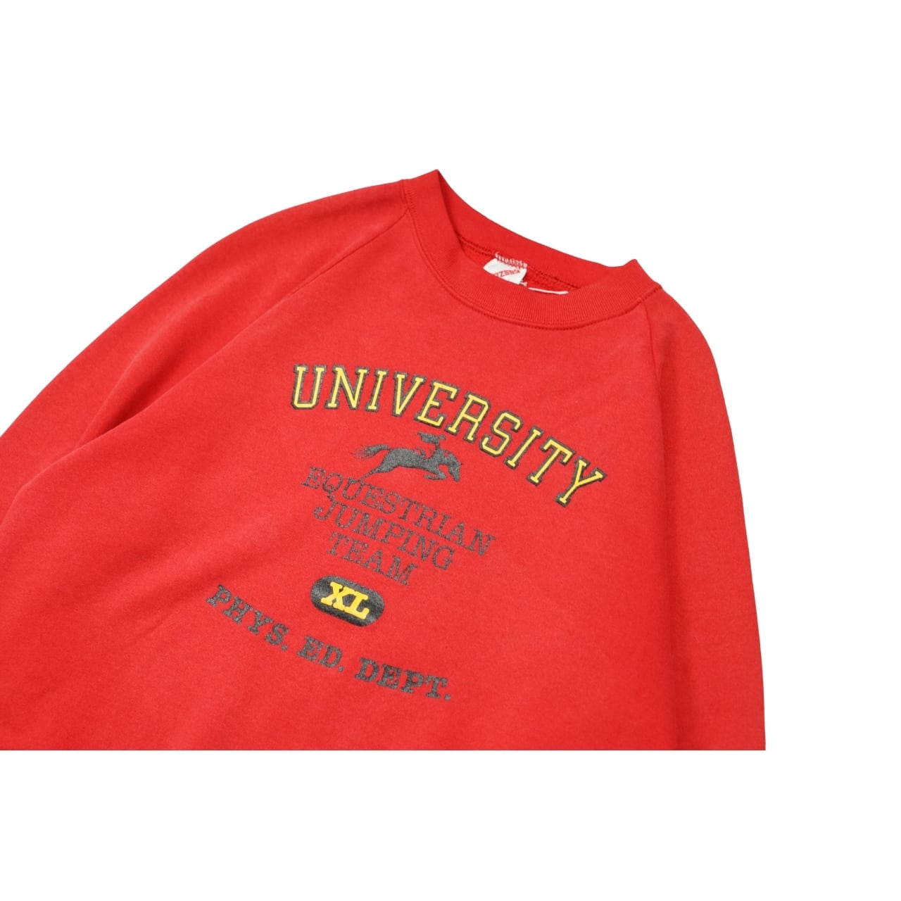 フロントには「UNIVERSITY Equestrian Jumping Team」「PHYS. ED. DEPT.」の文字と、グラフィックが配された一着。アメリカらしいカレッジ×スポーツテイストのデザインで、ヴィンテージスウェットならではの雰囲気があります。