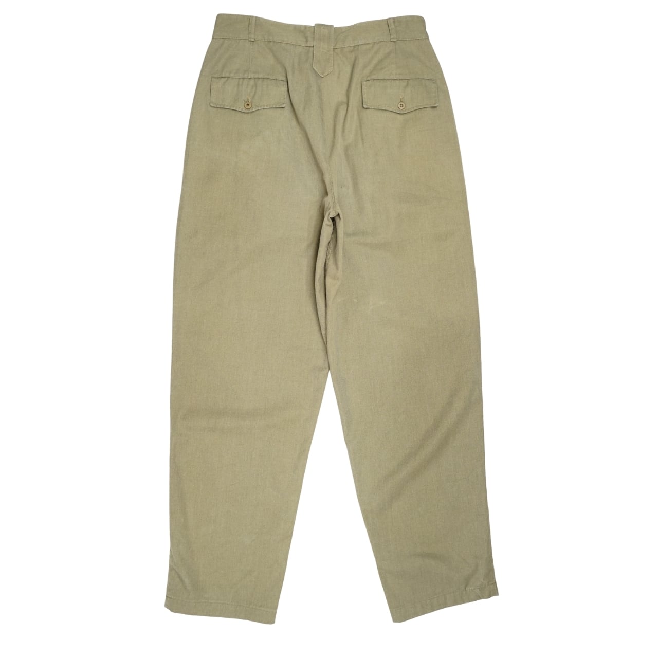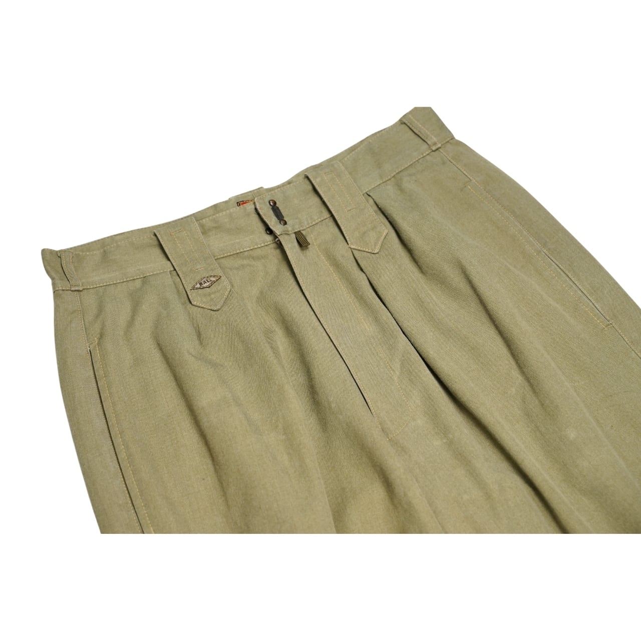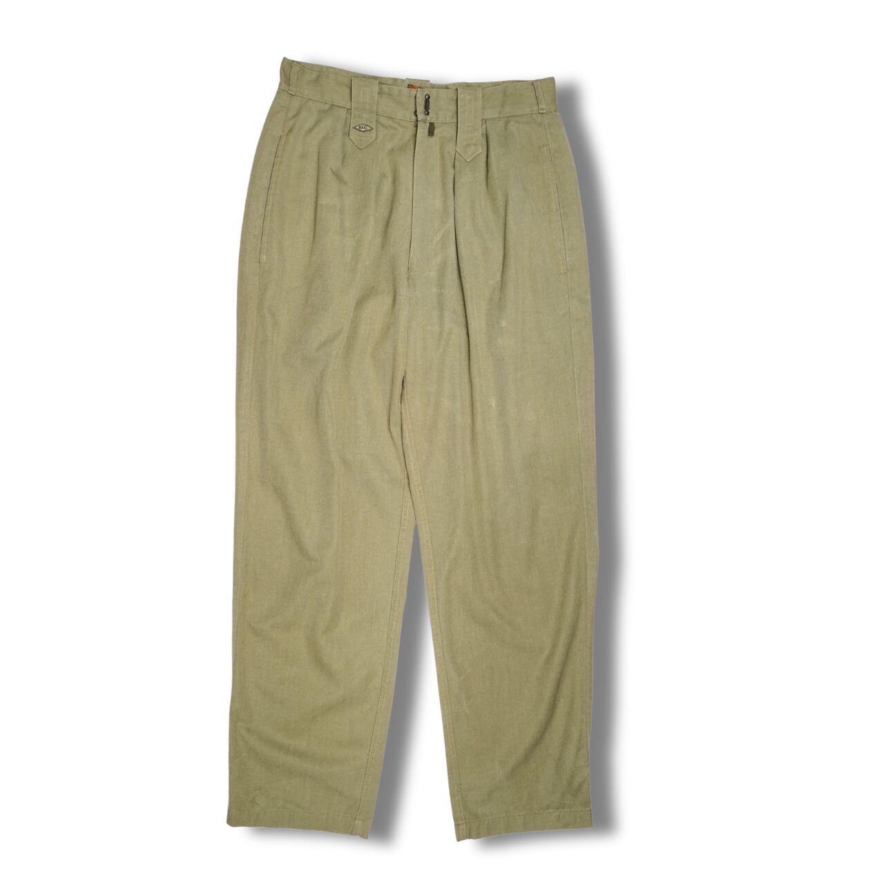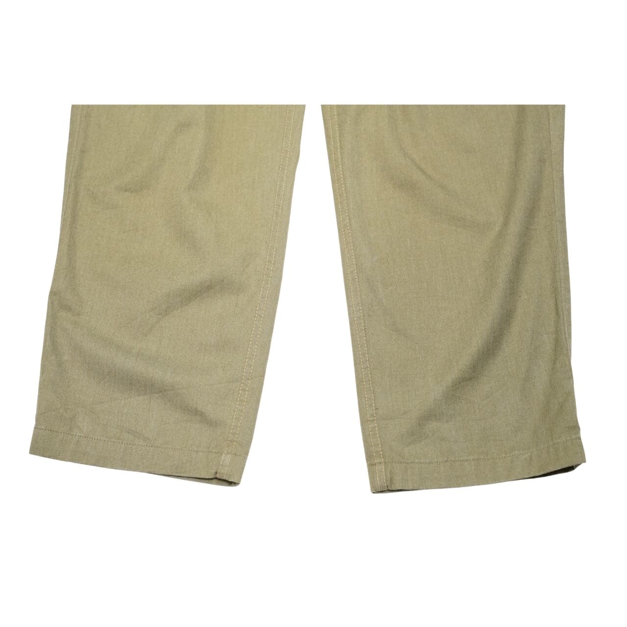 落ち着いたオリーブベージュ系カラーに、ほどよくハリと落ち感のあるポリエステル×ビスコース素材を使用した一本。