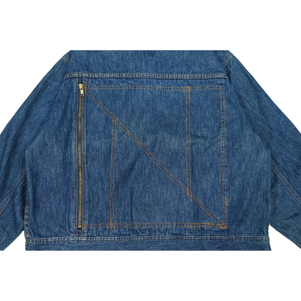 程よく色落ちしたインディゴデニムに、フロントとポケットのジップディテールが効いたデザイン。