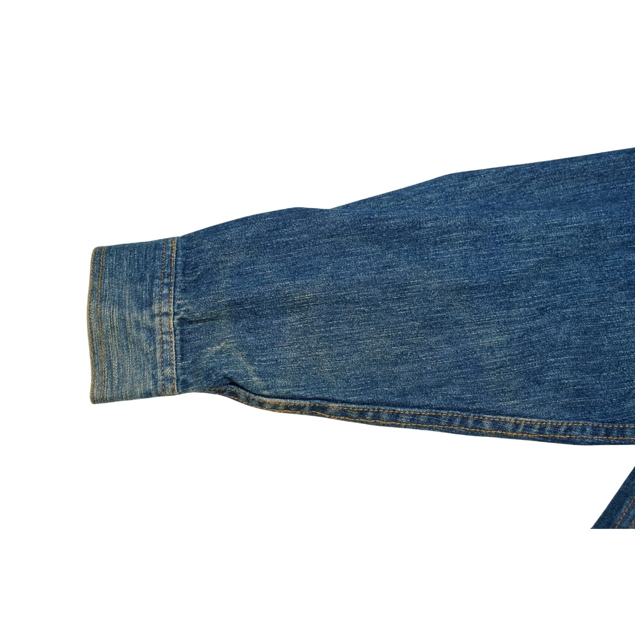 シャツやスウェットの上から羽織ってもバランスが取りやすく、デニムらしい無骨さとデザイン性の高さを両立しています。