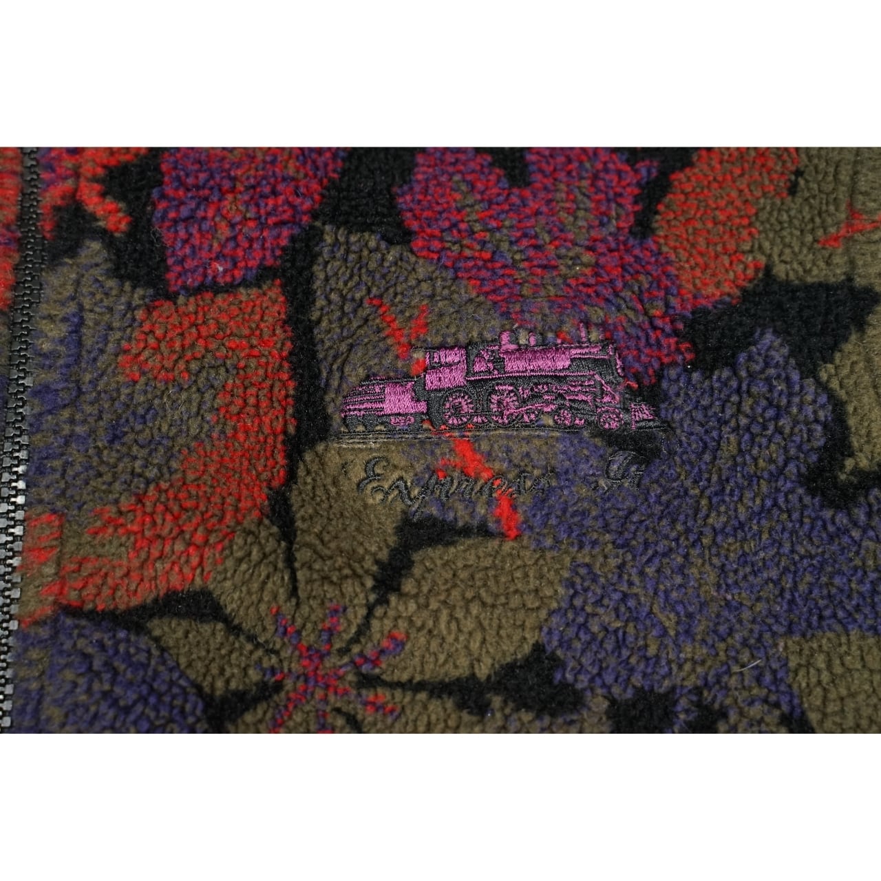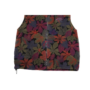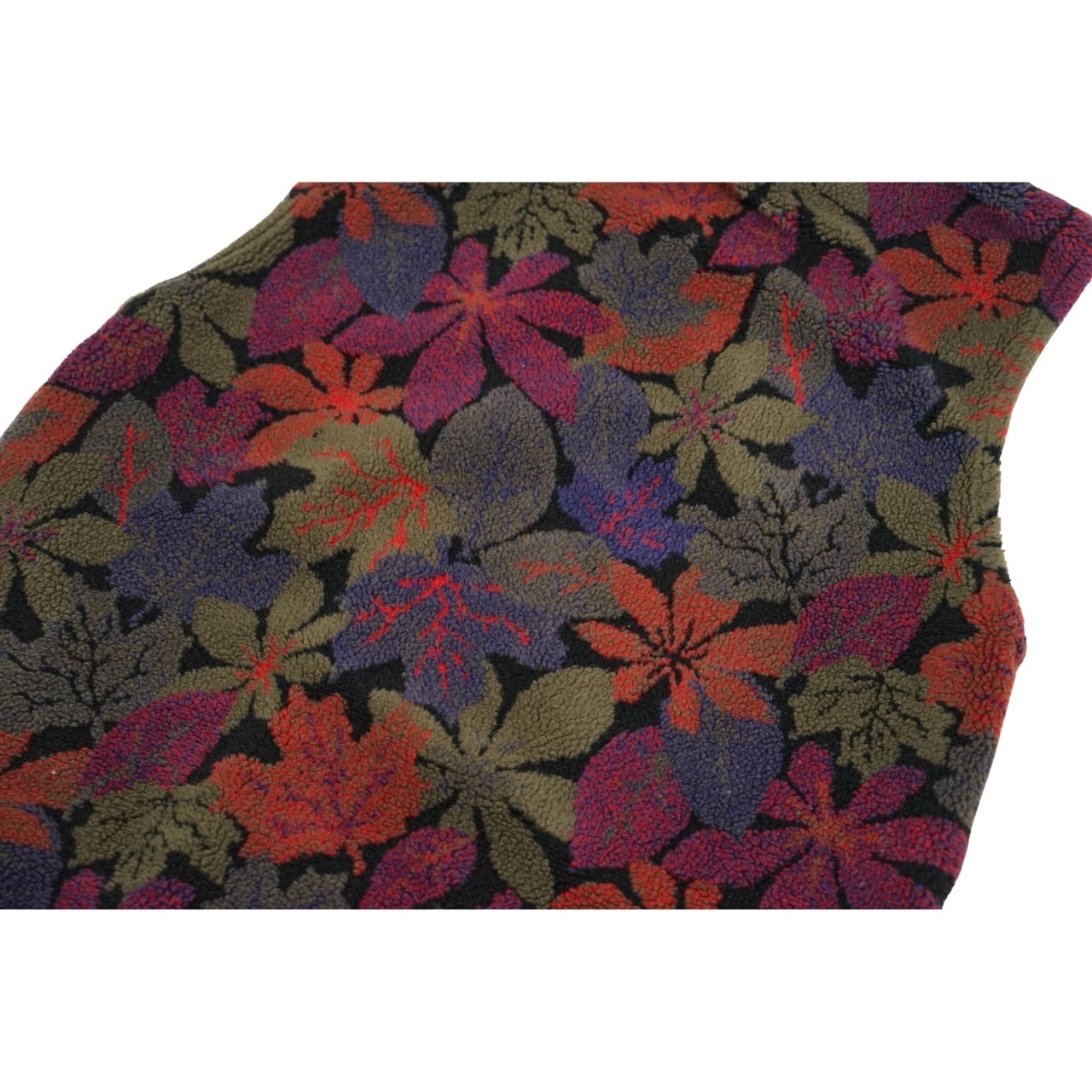 レッド、パープル、オリーブ系を基調にしたリーフモチーフの総柄デザインが印象的な一着。