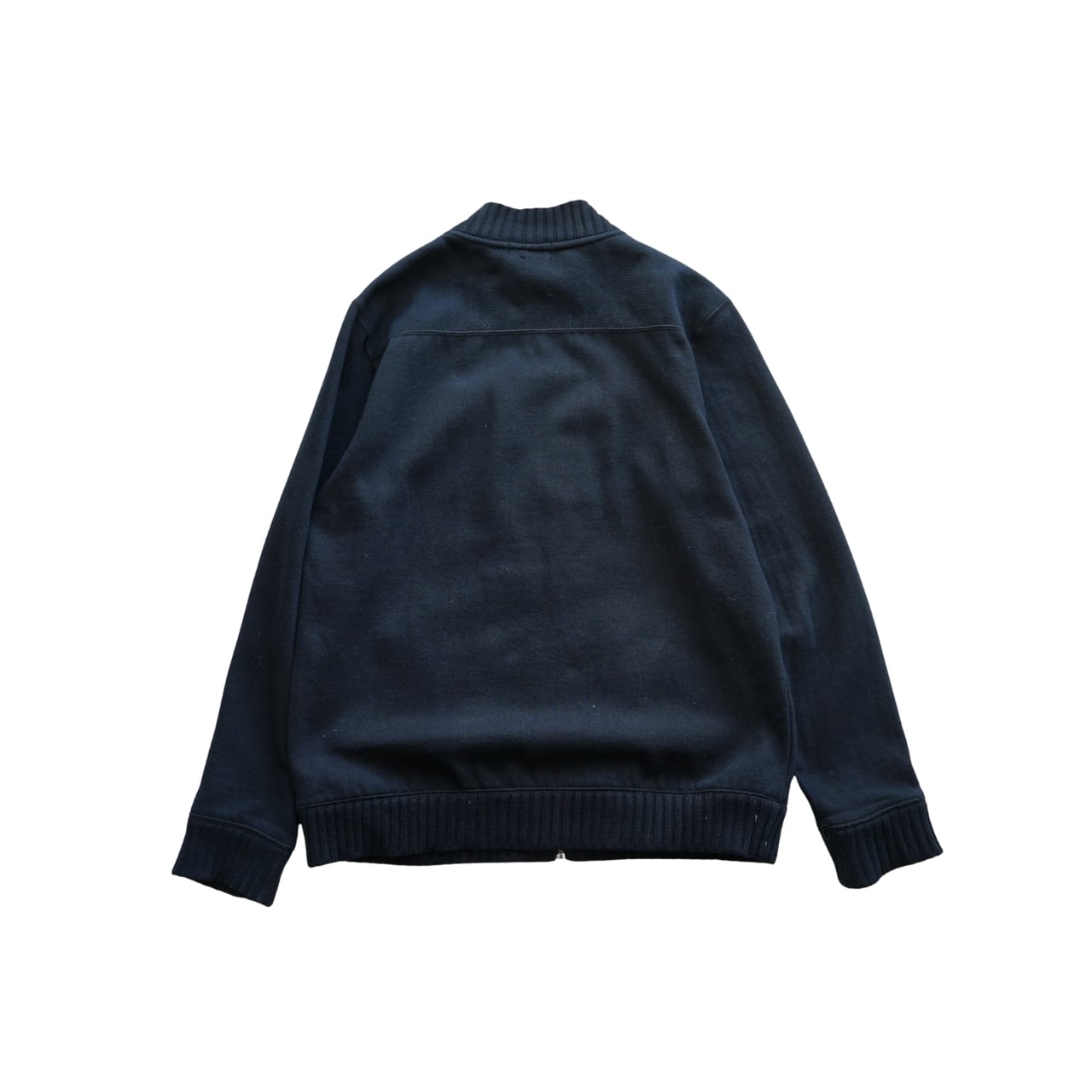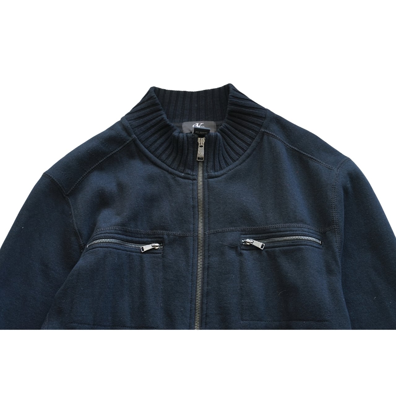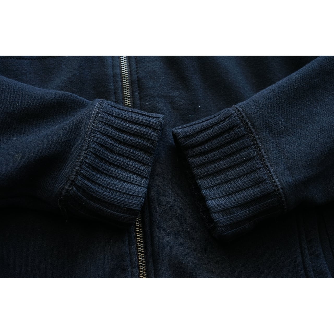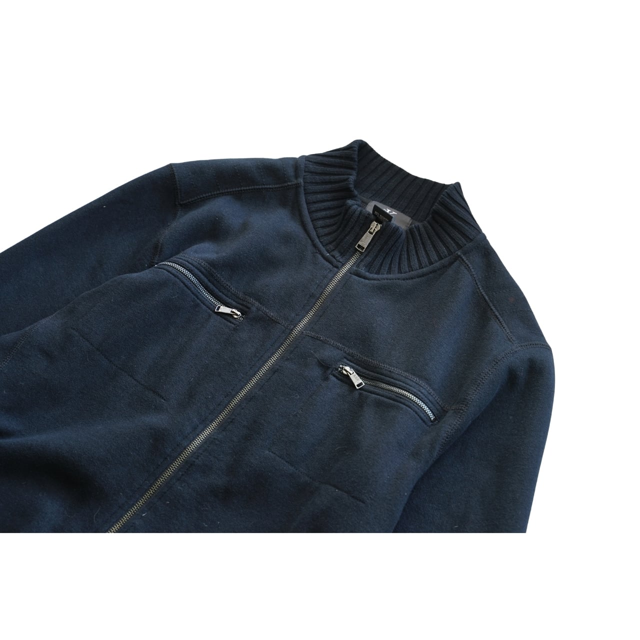 シンプルなネイビーカラーに、フロントジップと胸ポケットのジップディテールがアクセントになった一着。