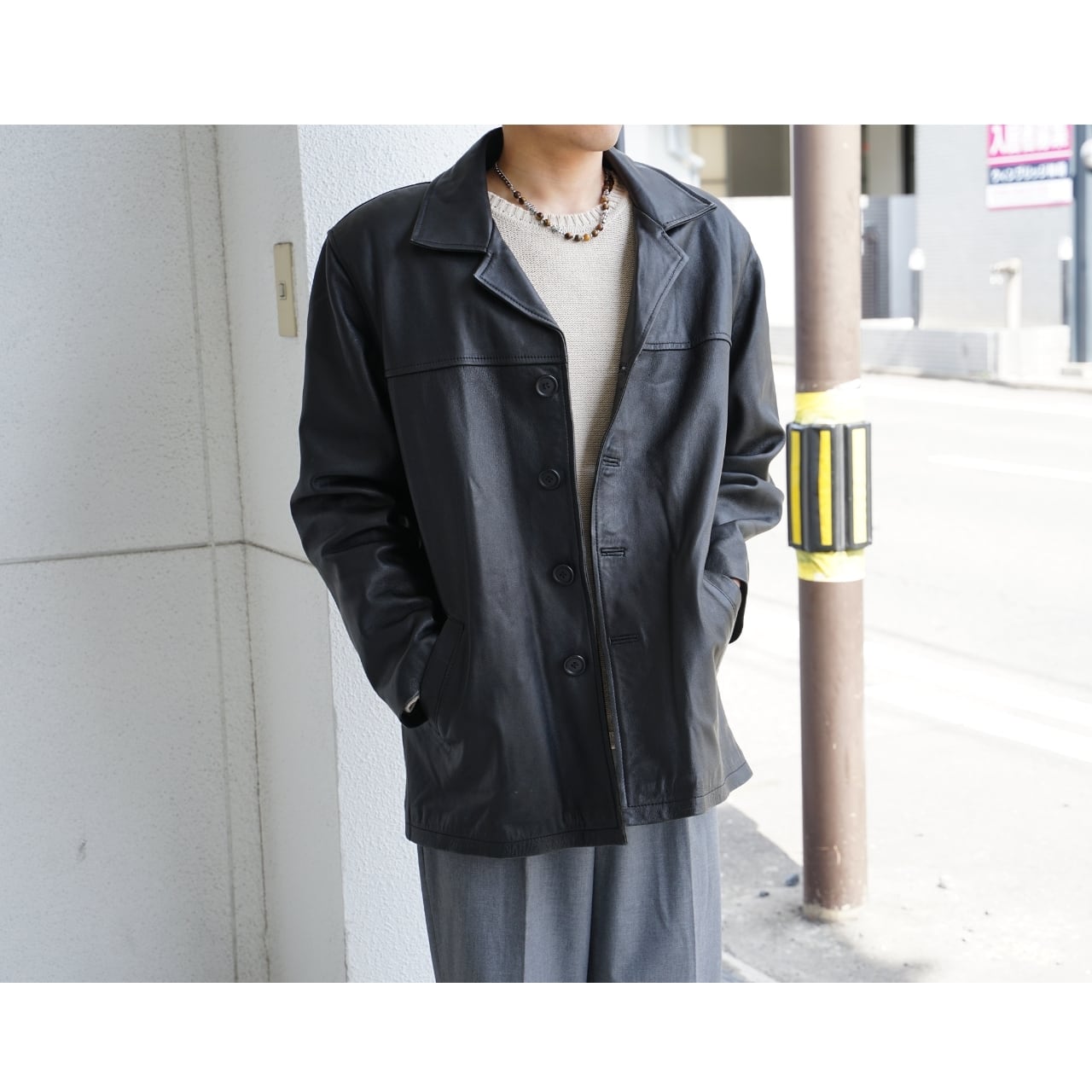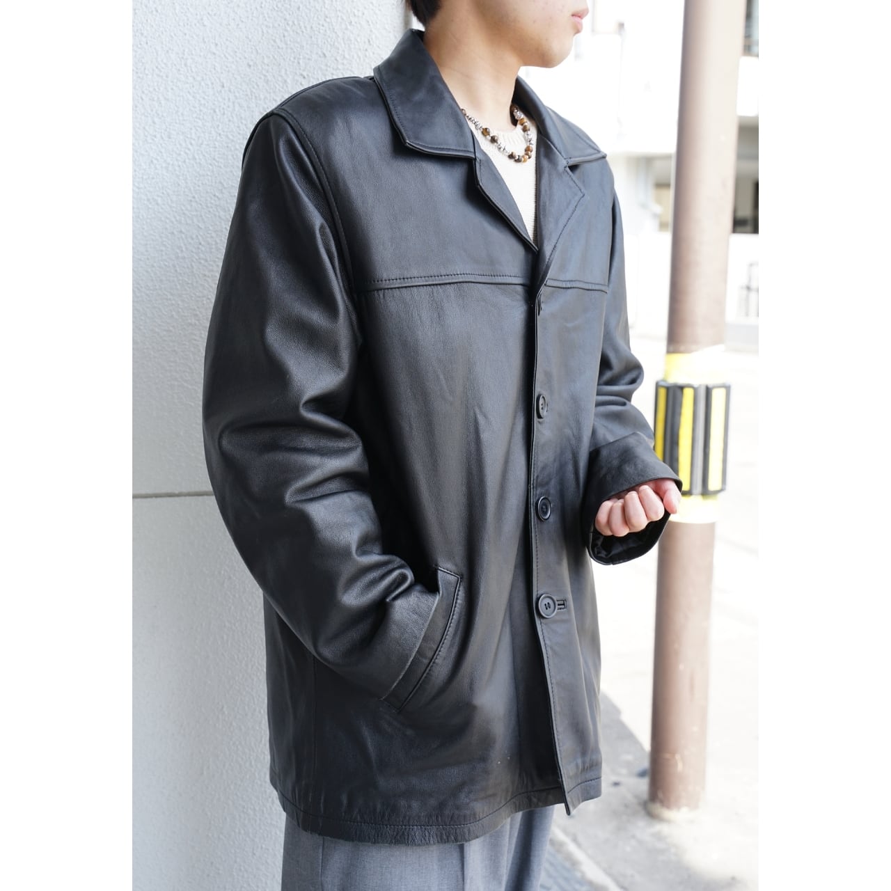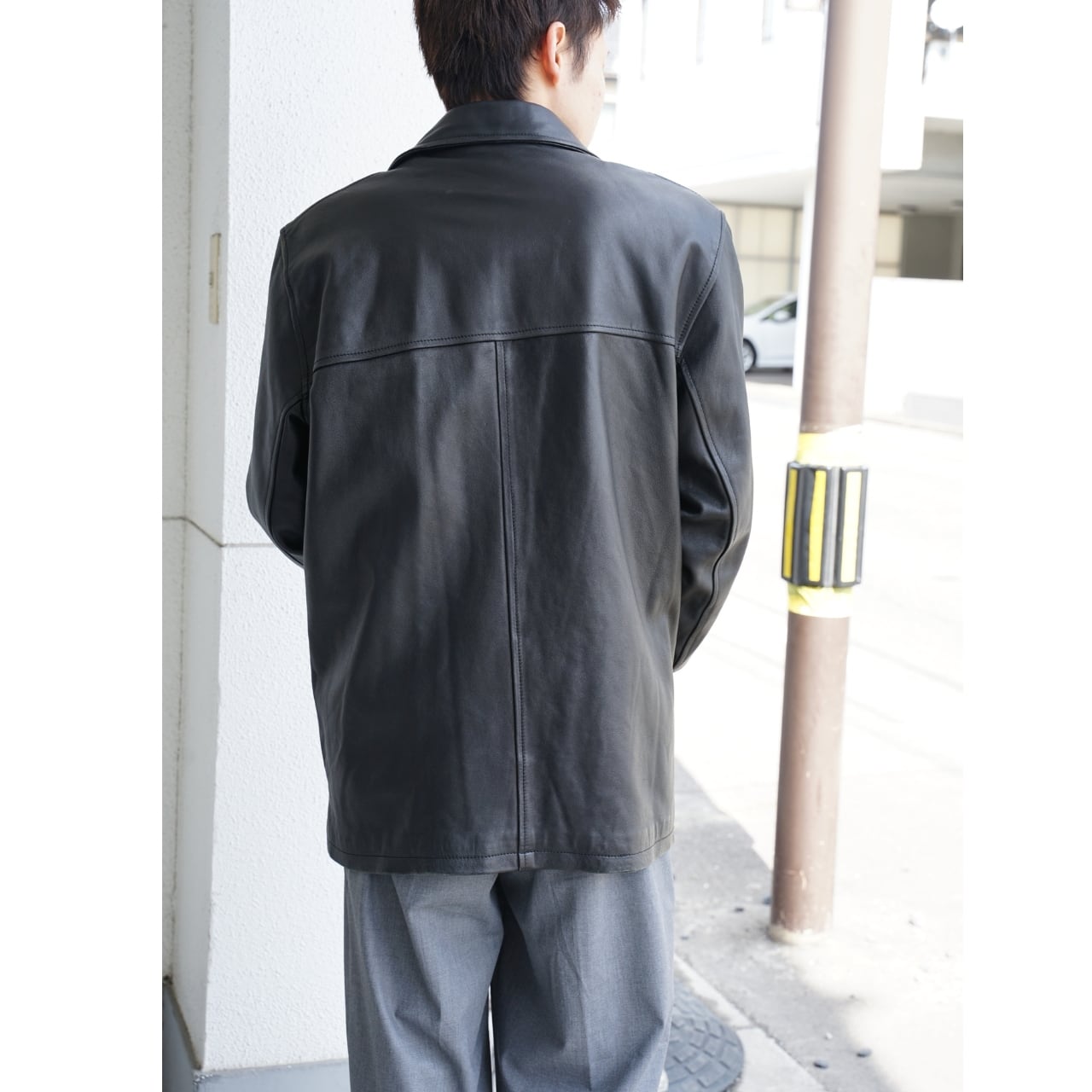 シンプルなブラックレザーなので、デニムからスラックスまで幅広いスタイリングに合わせやすい一着です。