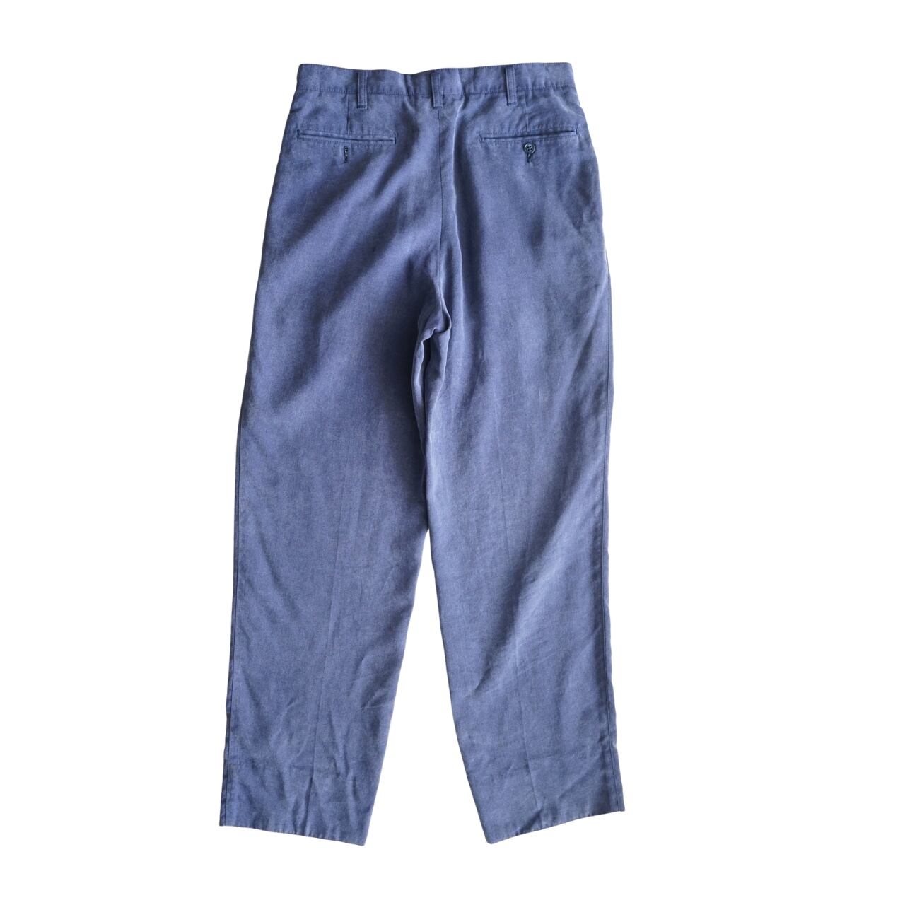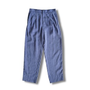 落ち着いたブルーカラーが印象的なツータックスラックス。