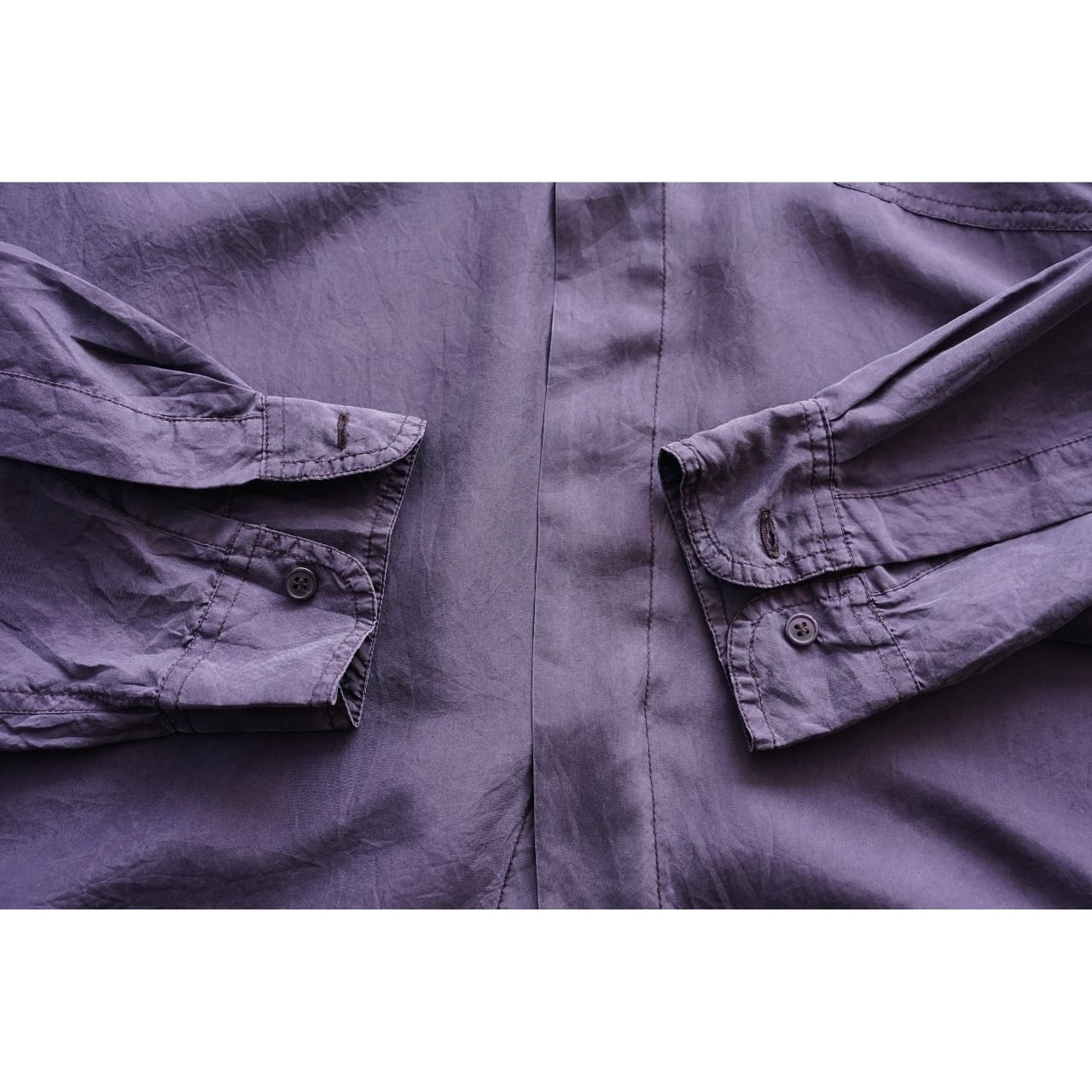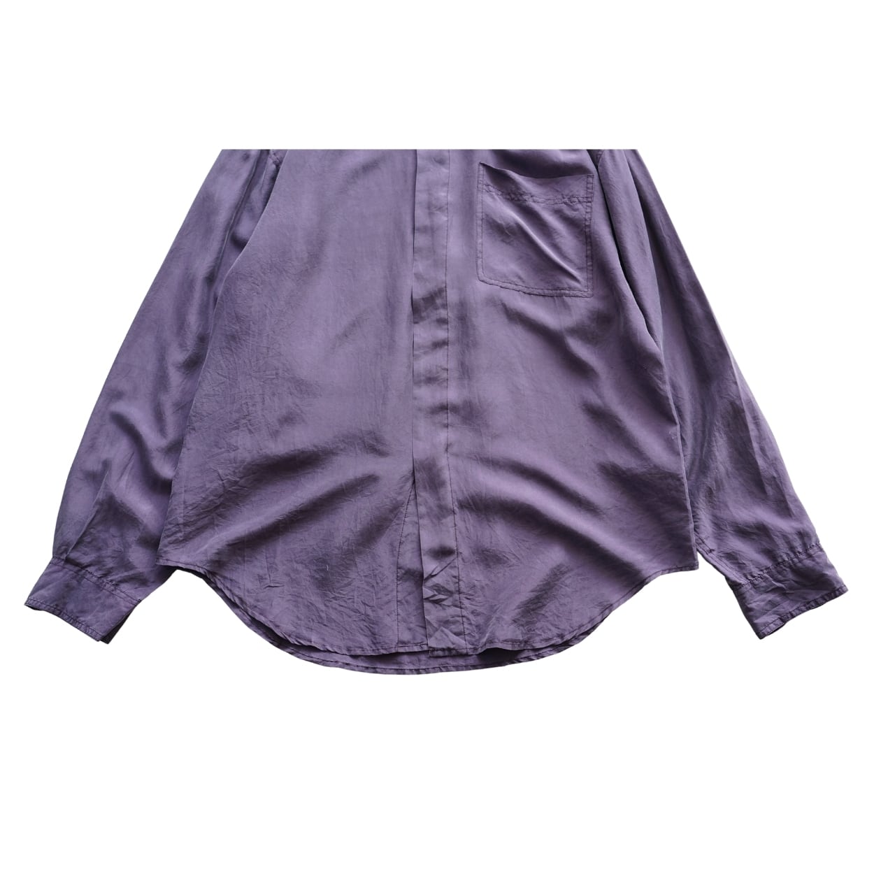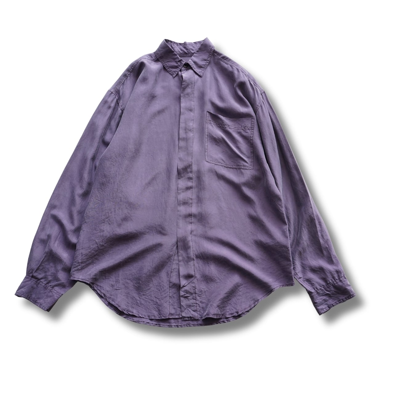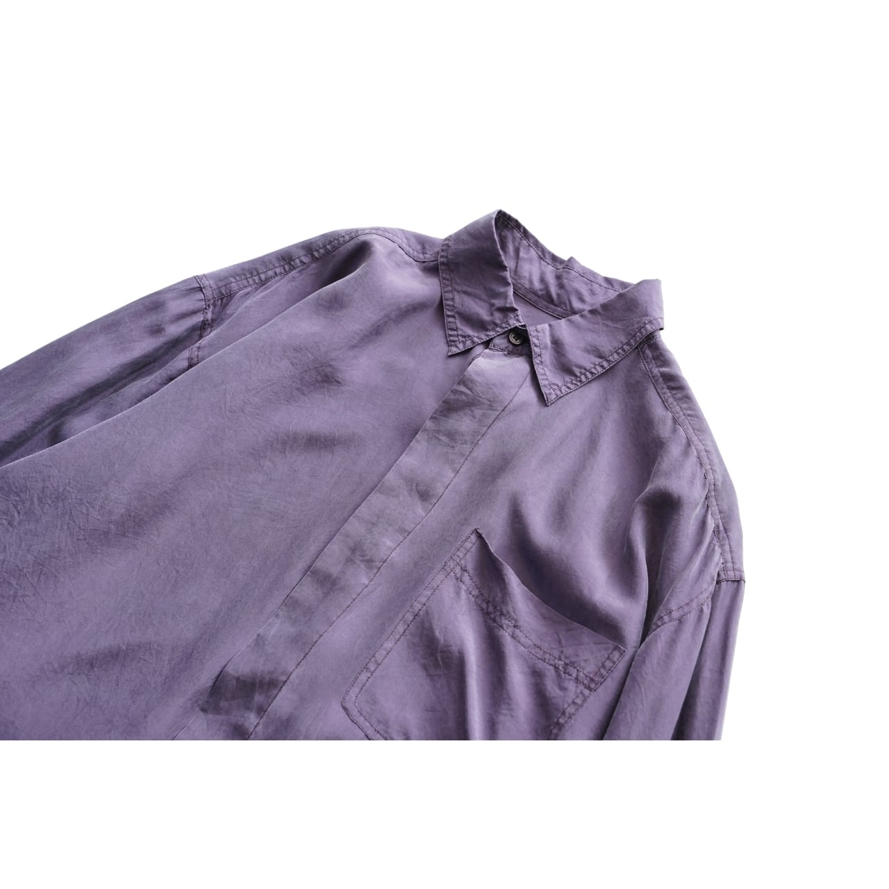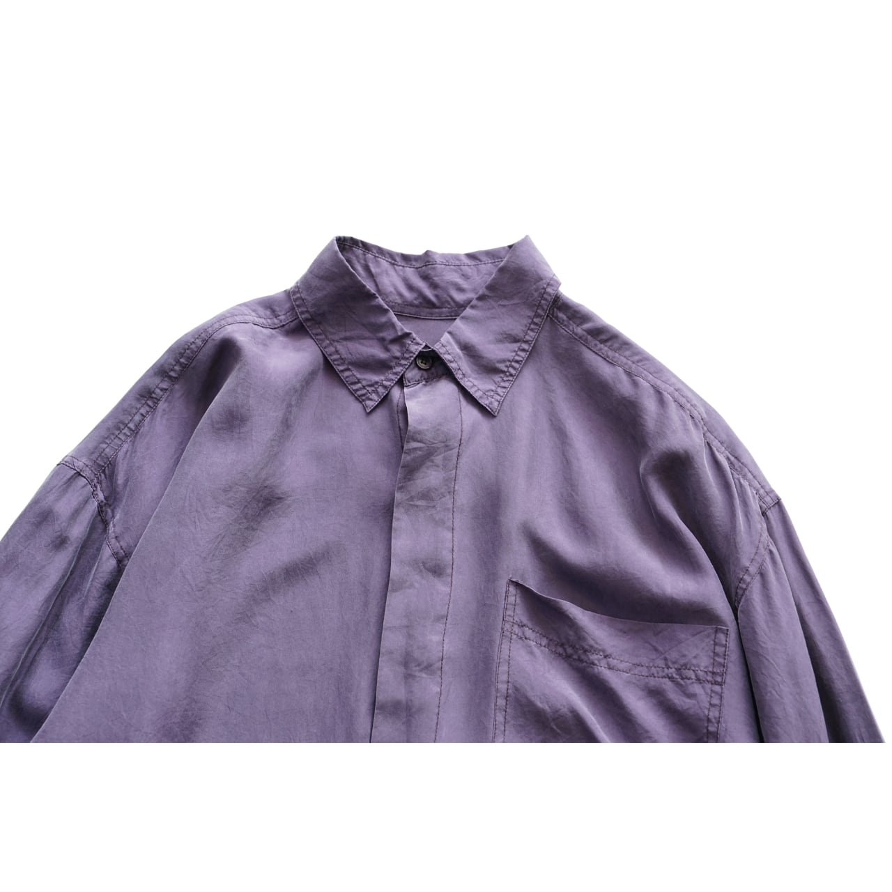 落ち着いたパープルカラーに、シルク特有のとろみと光沢が合わさった一枚。
