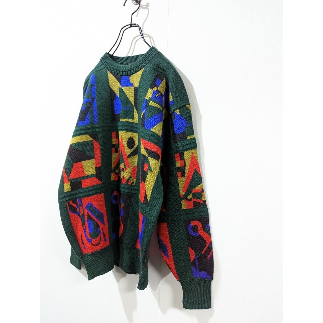 デザインニット 古着 グリーン ウール 総柄 パターン BS622