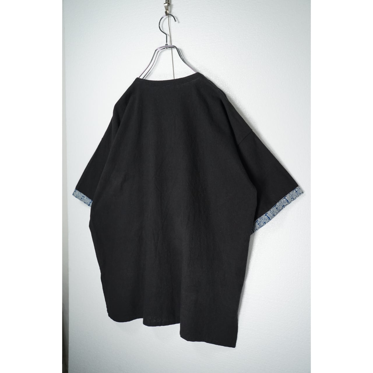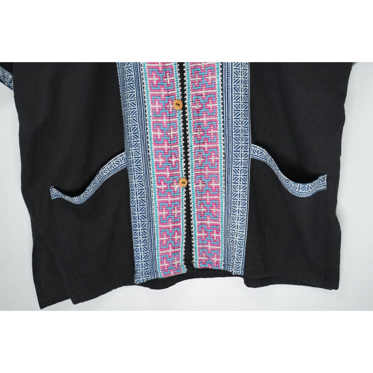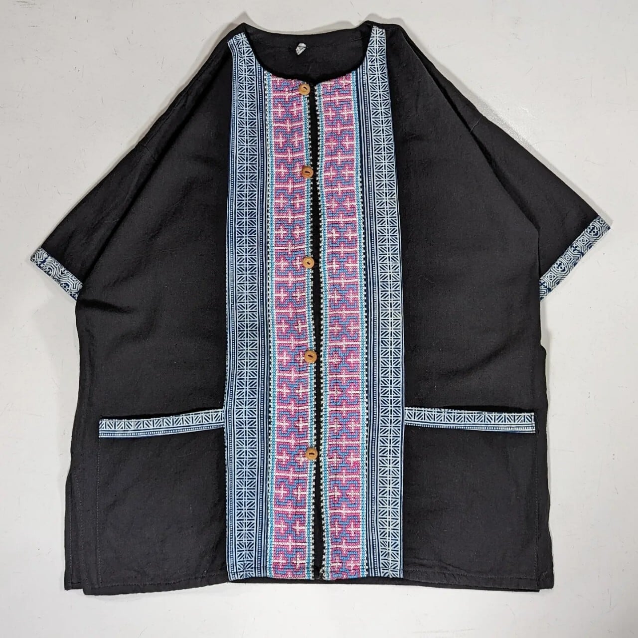 刺繍トップス 古着 ブラック 柄 ピンク ブルー ノーカラー PA211